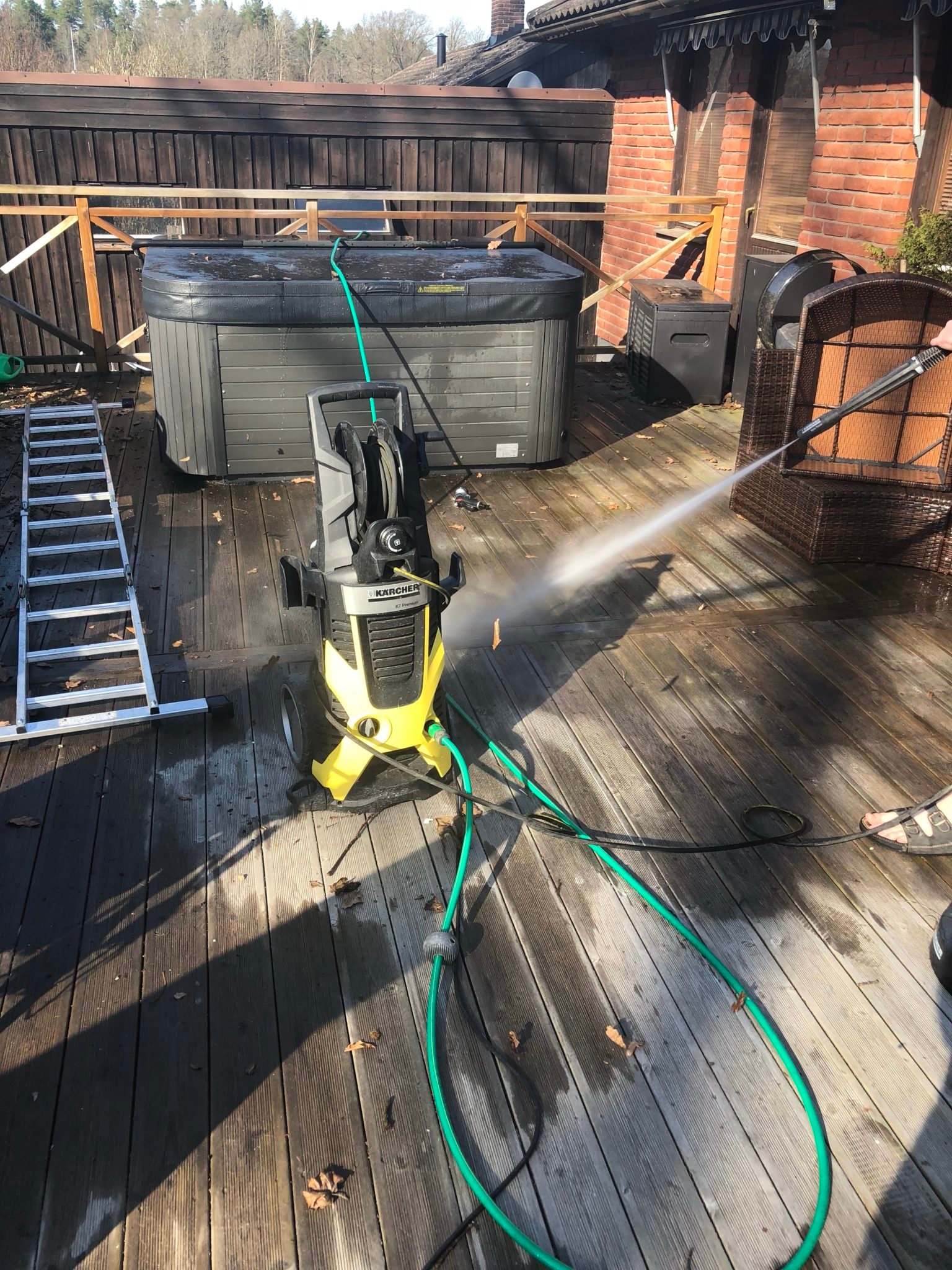 Så vi ”krattade” löv på vårt sätt! Vilket underbart sätt ! Vem behöver en lövblås eller kratta! Högtryckstvätt det är grejer det ! Alla löven bara försvann från altanen. Sen att dom hamnade rakt nedanför altanen istället och nu inväntar Östergrens nästa geniala plan för att slippa kratta upp dom. behöver vi inte gå in närmare på ?