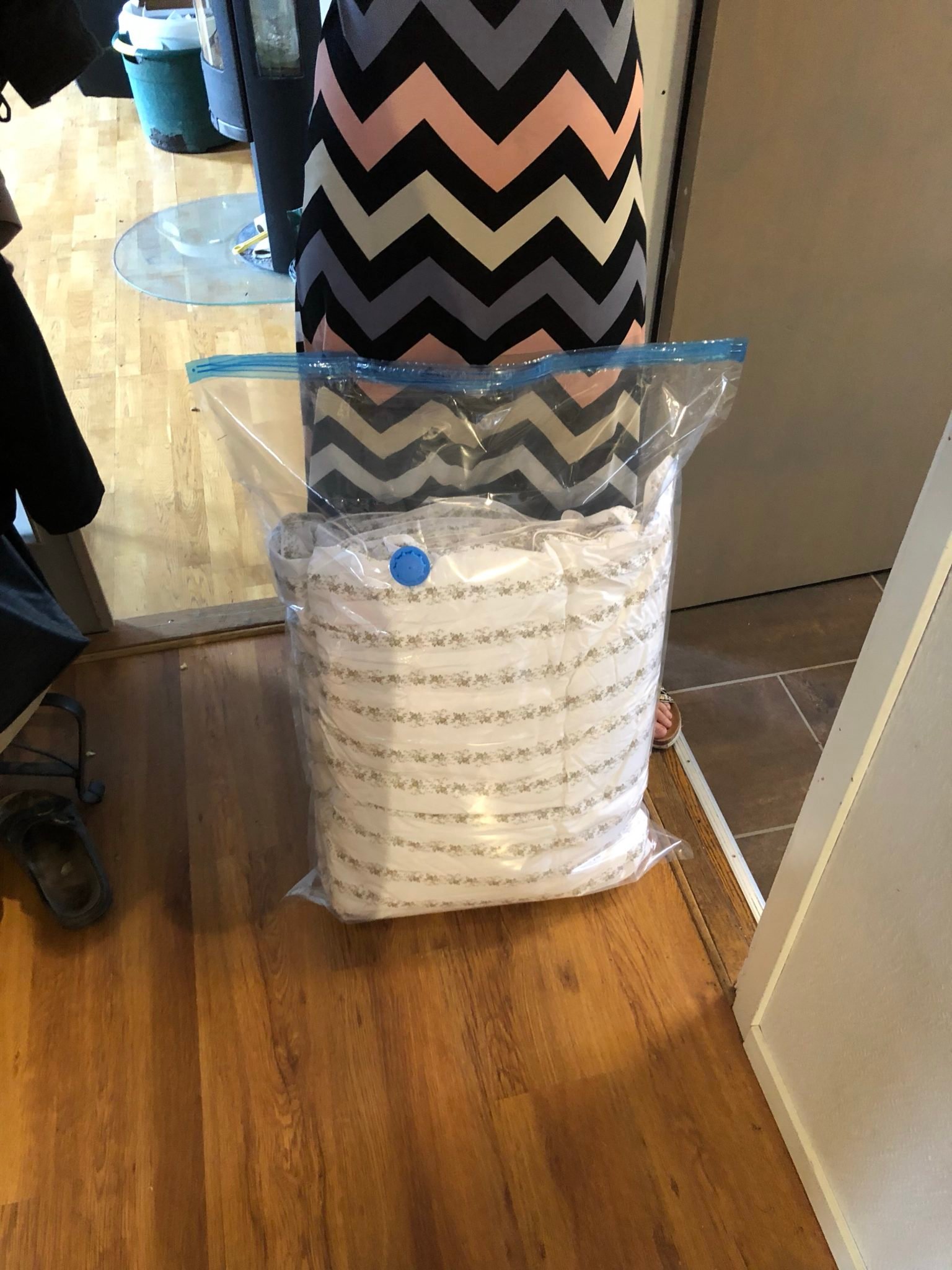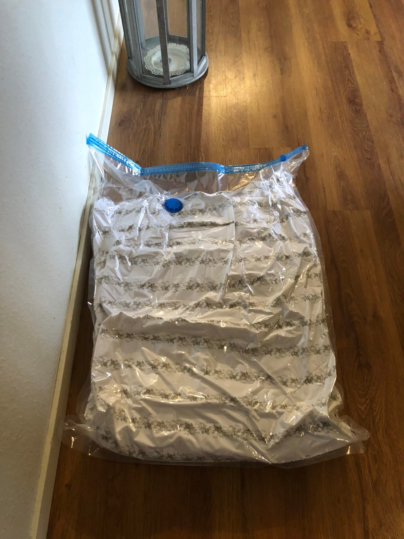 Väl hemma och med med min ständiga vapendragare vid min sida kände jag mig modig nog för att se om min briljanta plan med vakuumpåsarna skulle fungera, eller om vi ”bara” precis köpt tre nya täcken till våra sängar hemma.