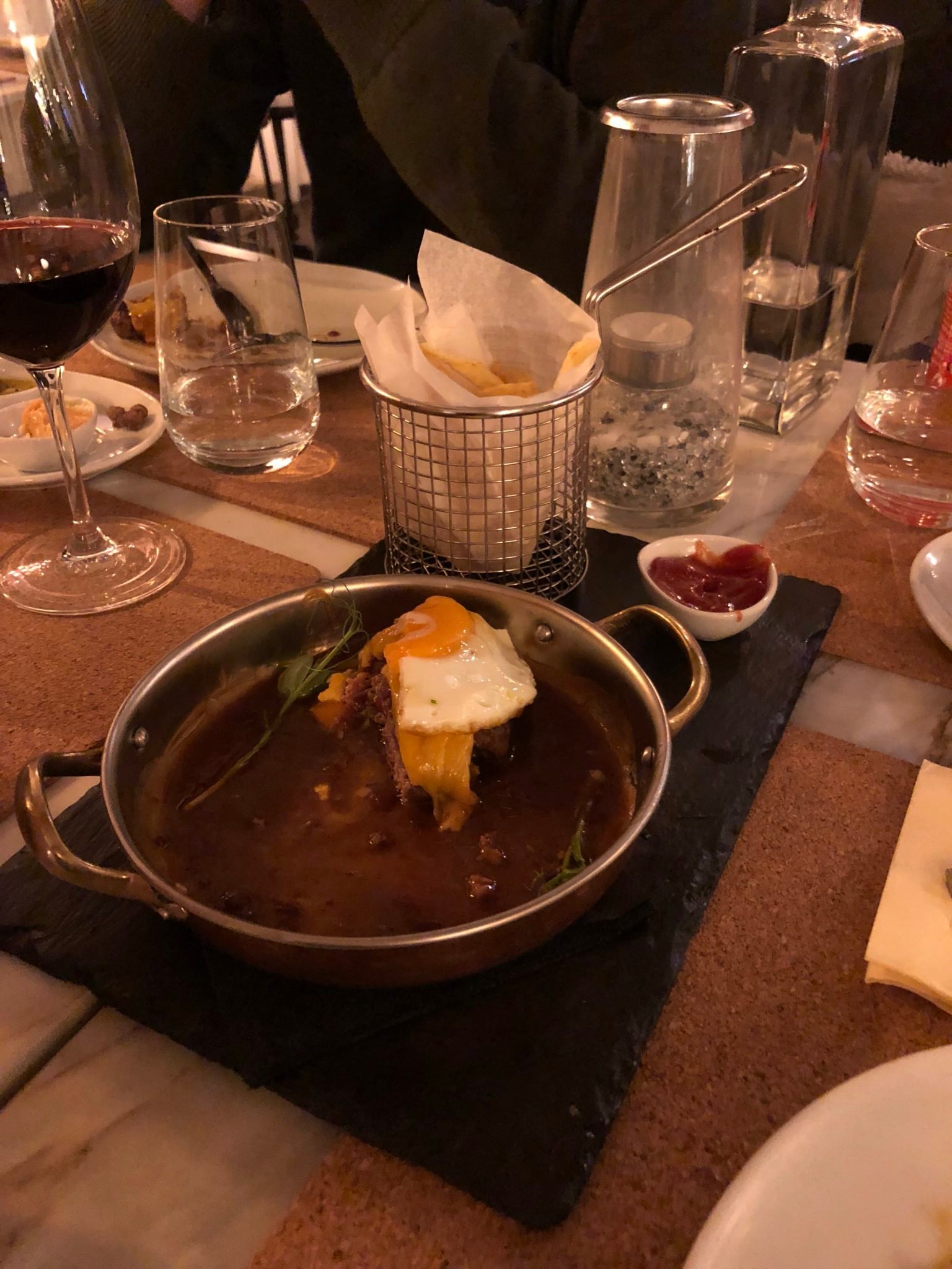 Vi tog en traditionell förrätt med bröd och oliver samt att vi testade en mini hamburgare som var fantastiskt god.