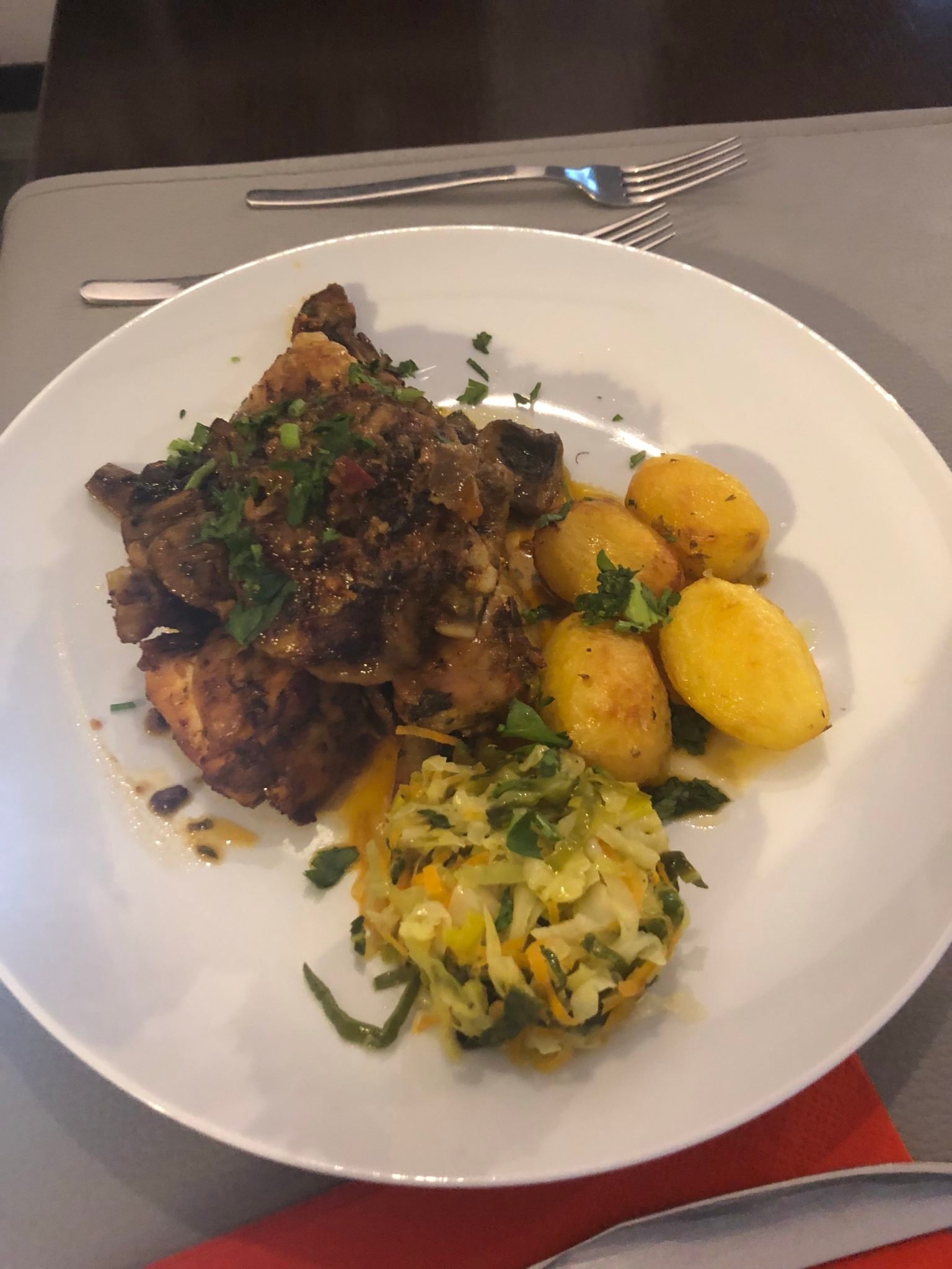 Tommy åt gårdskyckling som serverades med små fina potatisar. Han sa att den smakade fantastiskt, jag kan inte uttala mig då jag inte var och petade i hans tallrik ?