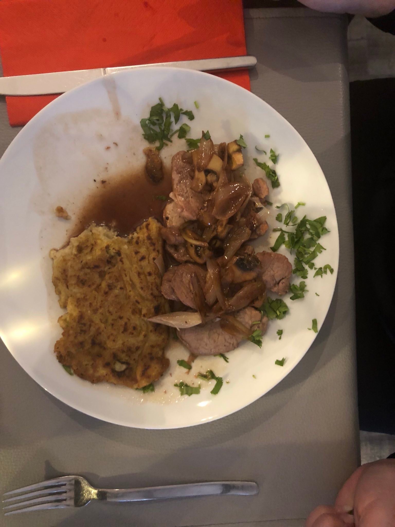 Jag åt filet mignon med någon typ av potatiskaka och portvinssky. Också väldigt smakrik där man inte överkryddat köttet med salt och peppar utan låter råvarans naturliga smak stå i centrum