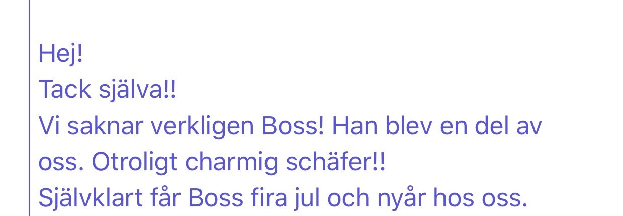 Först måste jag visa ett Mail vi fick från vårt hundpensionat. Dom är helt fantastiska och jag känner mig alltid trygg att lämna Boss där. Att sen Boss gjort ett sådant intryck på dom värmer verkligen