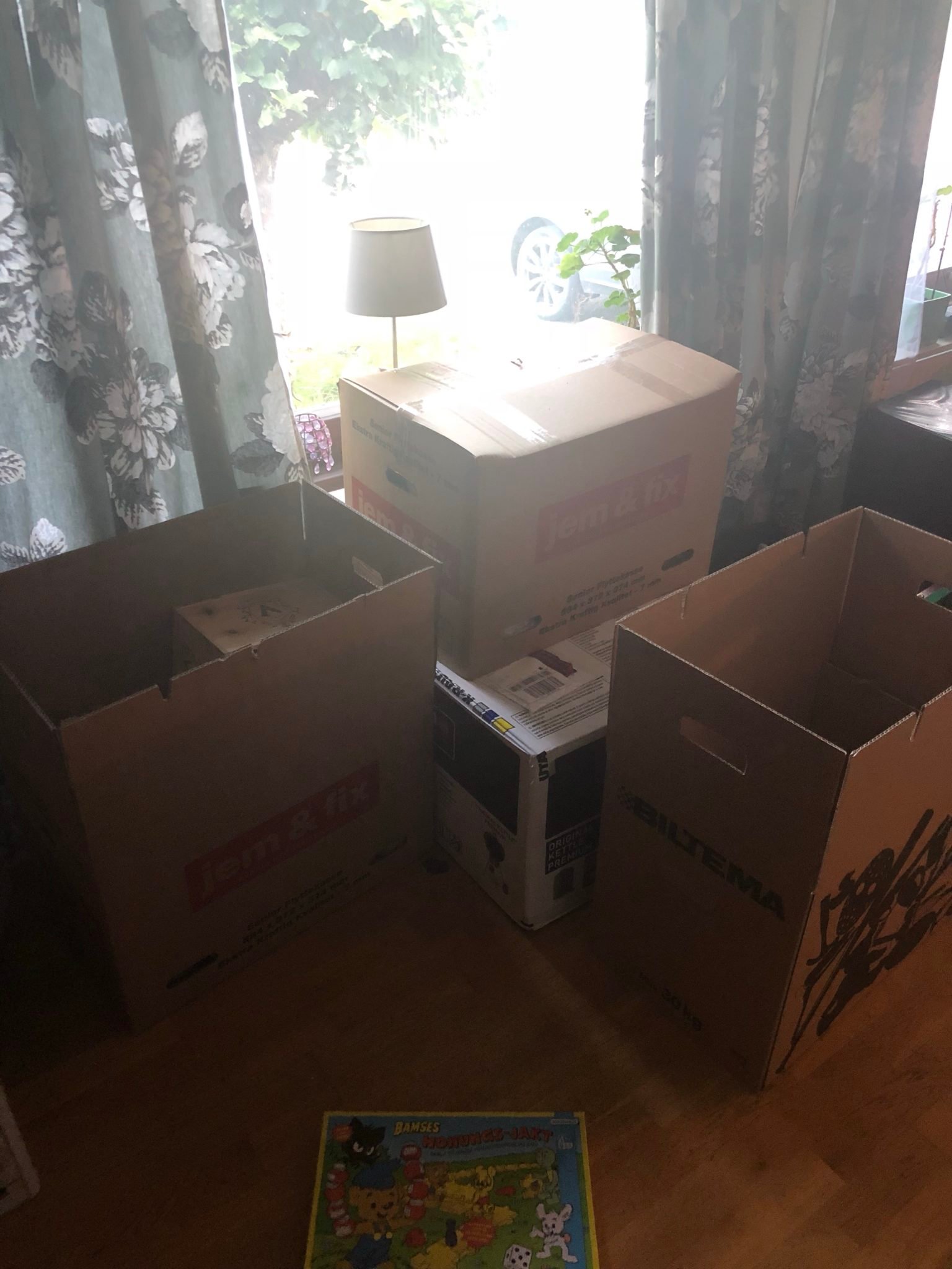 Huset i Sverige liknar mer och mer en gigantisk flyttkartong ? det står kartonger i stort sett överallt som är klara för att skickas ner.