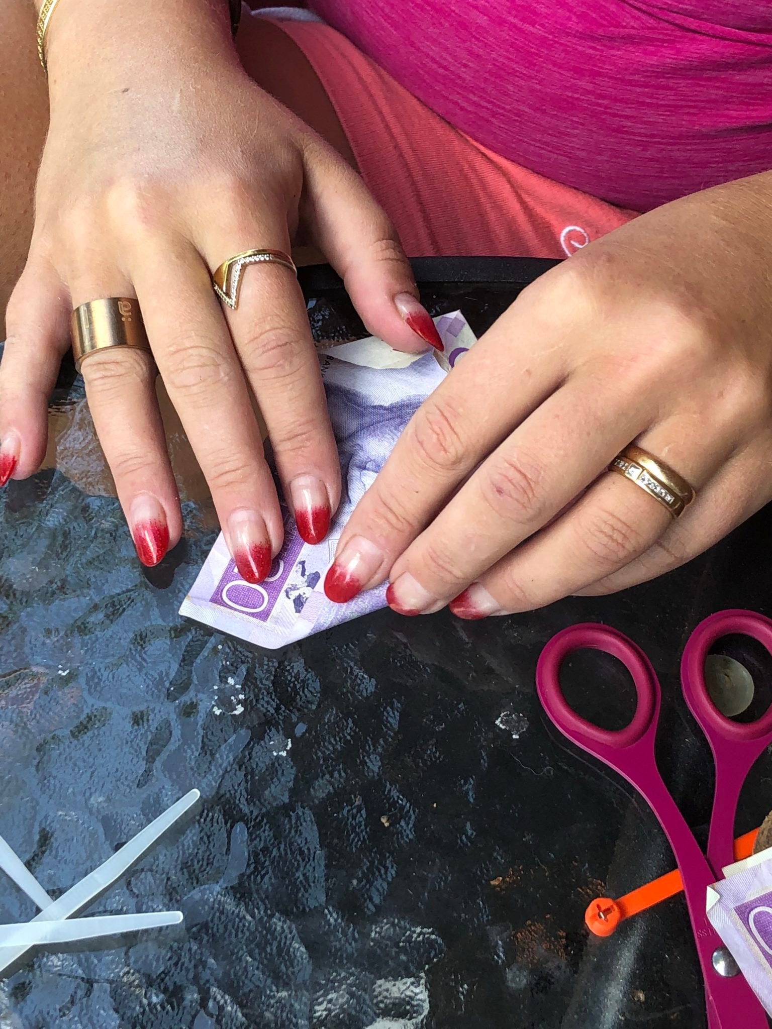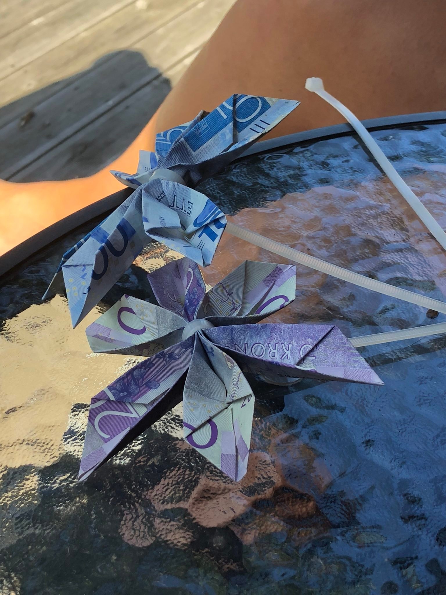 Jag ville ge henne lite pengar till det hon kan tänkas behöva. Men när jag stod där med en bunt sedlar i handen så kändes det verkligen så tråkigt att bara ge bort ett kuvert. Så det blev lite blommor av sedlar i stället.