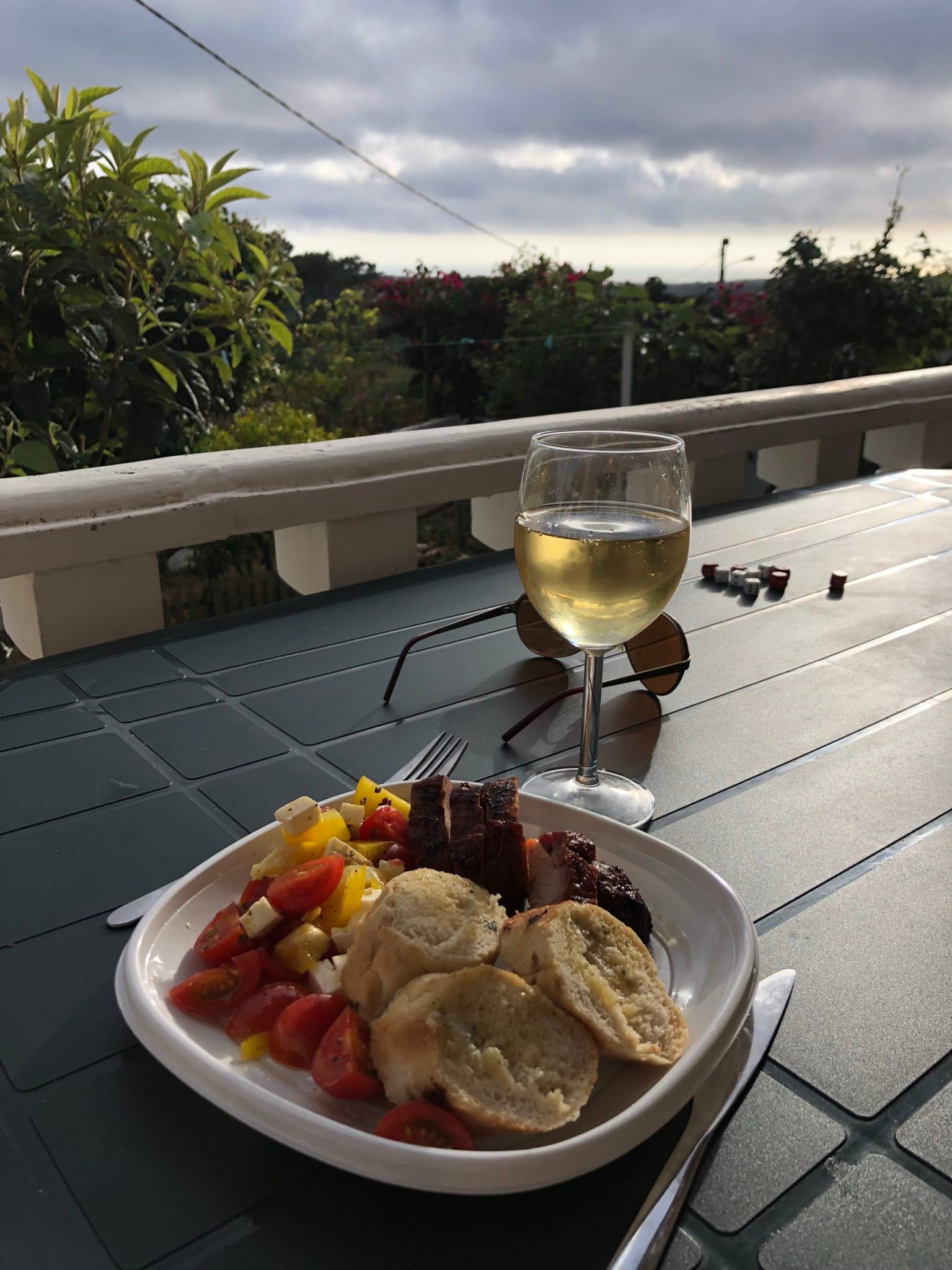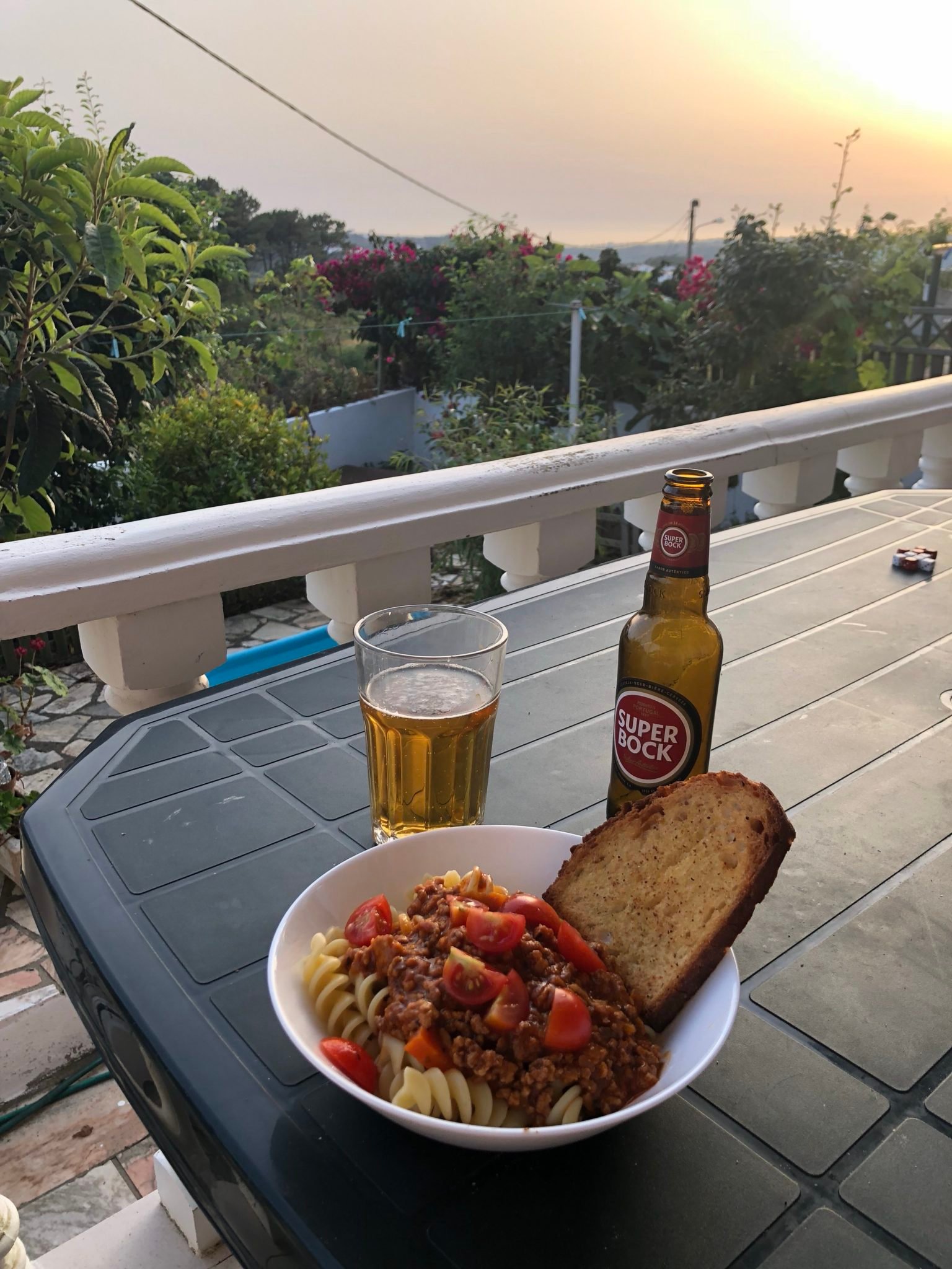 Vi har fyndat en massa god färs här nere som vi lagt i frysen, så till kvällsmat blev det en variant av köttfärssås. Med en kanon god tomatsås och med en blandning av nöt och fläskfärs. Med en massa färska goda grönsaker. Serverades tillsammans med lite pasta och hemgjort vitlöksbröd. Vart nästan lite mäktigt i värmen men ändå kanon gott och så roligt att laga mat här.
