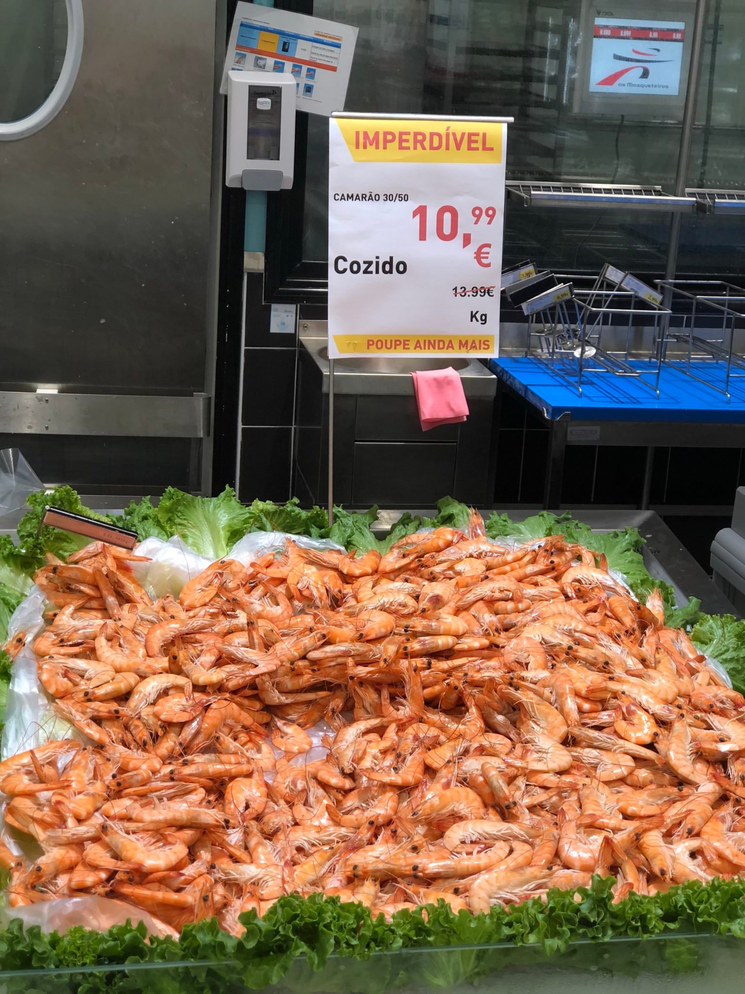Jo men så att det går ingen nöd på oss här gällande maten ? ( absolut inte på något annat sätt heller ) men vi börjar känna oss hemma i dom butiker vi handlar i och vi lär oss vad som är för och nackdelen mellan dom olika butikerna som finns i närheten. Häromdagen var vi på en tur till Ericiera och handlade på en av dom första butikerna vi handlade i när vi kom hit första gången för att titta på hus. Vi mötte en väldigt trevlig man i fiskdisken då vi äntligen vågade oss på att beställa färska camaroes ( ska vara något vågliknande tecken över o:et ) han både pratade bra engelska och försökte lära Fredrik det portugisiska uttalet ? underbart! Så här ser dom ut räkorna ? något större än vad vi är vana vid. Och nej det är inte gambas ! Dom är ännu större här.