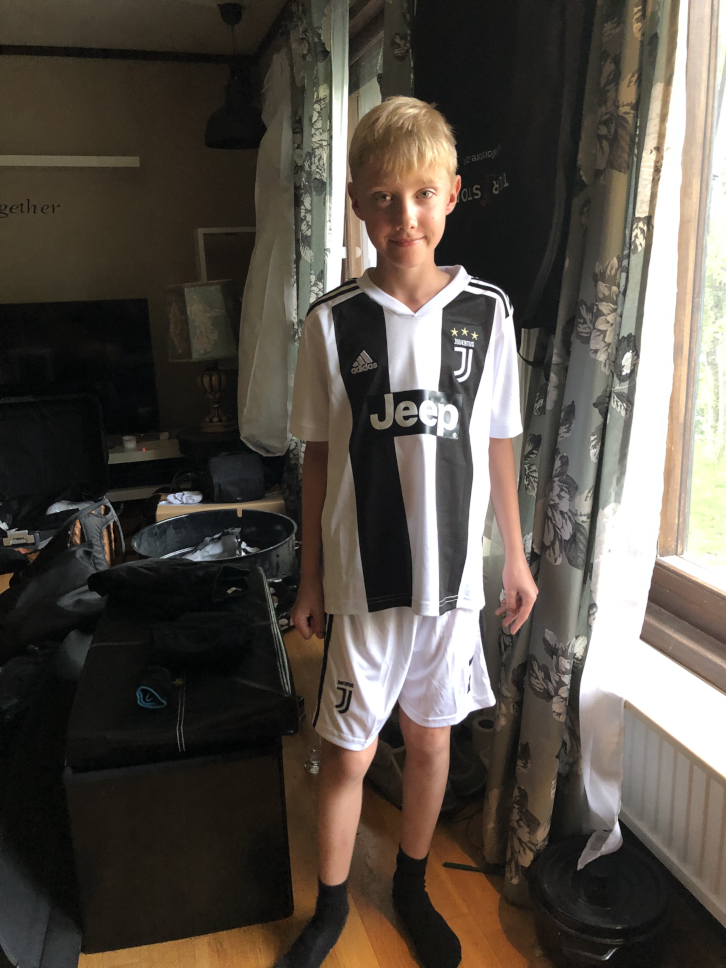 Junior har fullt upp, Lek och skola det är det han gör just nu och såklart fotboll, det var matcher i helgen som han kunde åka på tillsammans med farfar ( mamman och pappan var upptagna med att packa ) Kul att den stora idolen är Ronaldo ( extra kul att han är från just Portugal) Tack vare lite hjälp och även presenter är han nu kittad som en liten Ronaldo ?