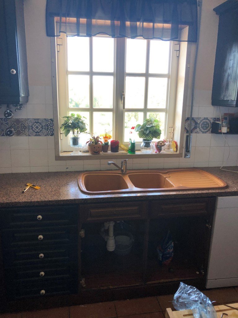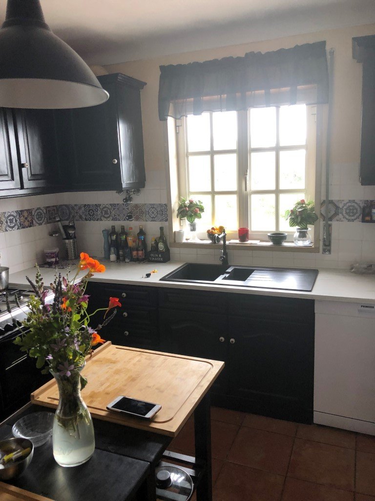 Redan när vi flyttade in förstod vi att vi ville ha ett annat kök, men vi ville återanvända layouten och det var faktiskt inget fel på dom befintliga skåpen (förutom färgen ), så vi kom på idén att måla om köket och bara köpa bänkskiva och lite dekor nytt. Och det har vi pysslat med varje resa hit, slipa måla, slipa måla ? vilket gjort att vi oftast saknat vissa delar av vårt kök,