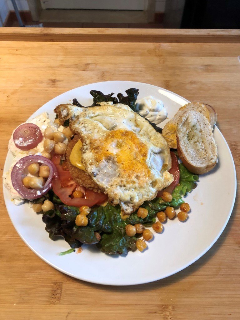 På denna bild är det rostade kikärtor med rödlök och fetaost, tillsammans med en kycklingburgare. Kan tillägga att brödet på både hamburgaren och vitlöksbrödet var överflödigt ? men gott vart det. Enda tråkiga med kikärtor är att det är med risk för rejäla brännskador man steker dom ? dom poppar ju värre än popcorn över halva köket ? vilket resulterar i en hel del köksstädning. (och ja, jag har gjort dom i ugnen också men det poppar lika mycket där och arbetsställningen som krävs för att göra rent ugnen jämfört med spisen gör att jag ändå ofta väljer stekpannan ?)
