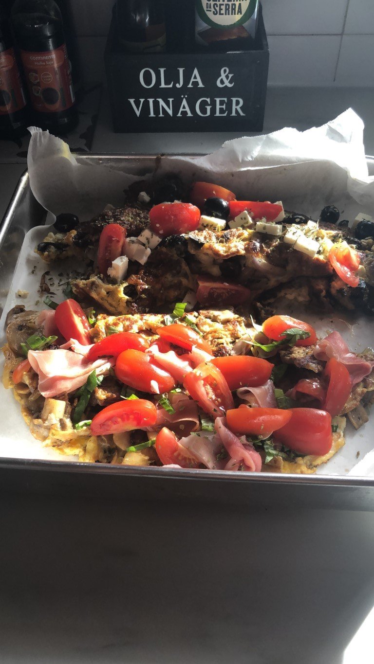 Jo Omeletter, ? en Grek-inspirerad med fetaost, oliver, och rödlök ( vilket vart juniors favorit) och så en med färska champinjoner, lök och lufttorkad skinka. Toppade med dessa underbara tomater som smakar ljuvligt.